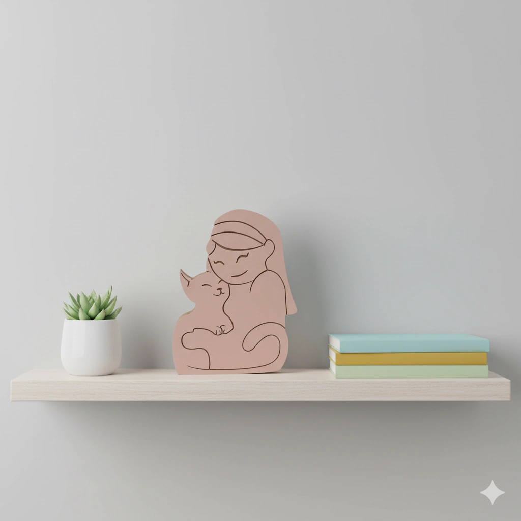 A escultura “Abraço Pet - Menina e Gato” é esculpida em madeira MDF de alta qualidade, representando o abraço carinhoso do animal de estimação.